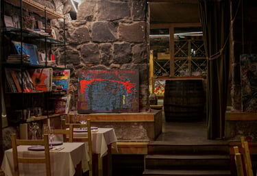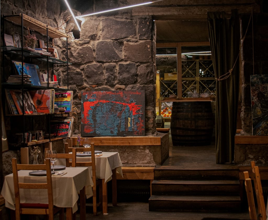 Nestled in a stone-and-concrete-walled mid-basement space, The Club offers an unforgettable experience in the heart of Yerevan. Immerse yourself in the vibrant flavors of the Armenian highlands, paired with wines from our vineyard, all while surrounded by the captivating art of local creators. A perfect fusion of cuisine, culture, and creativity awaits.