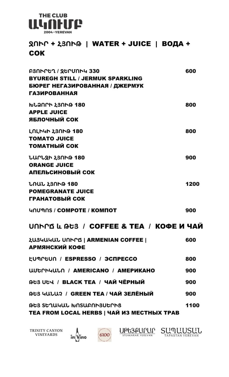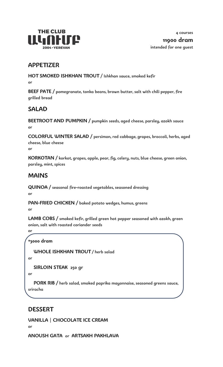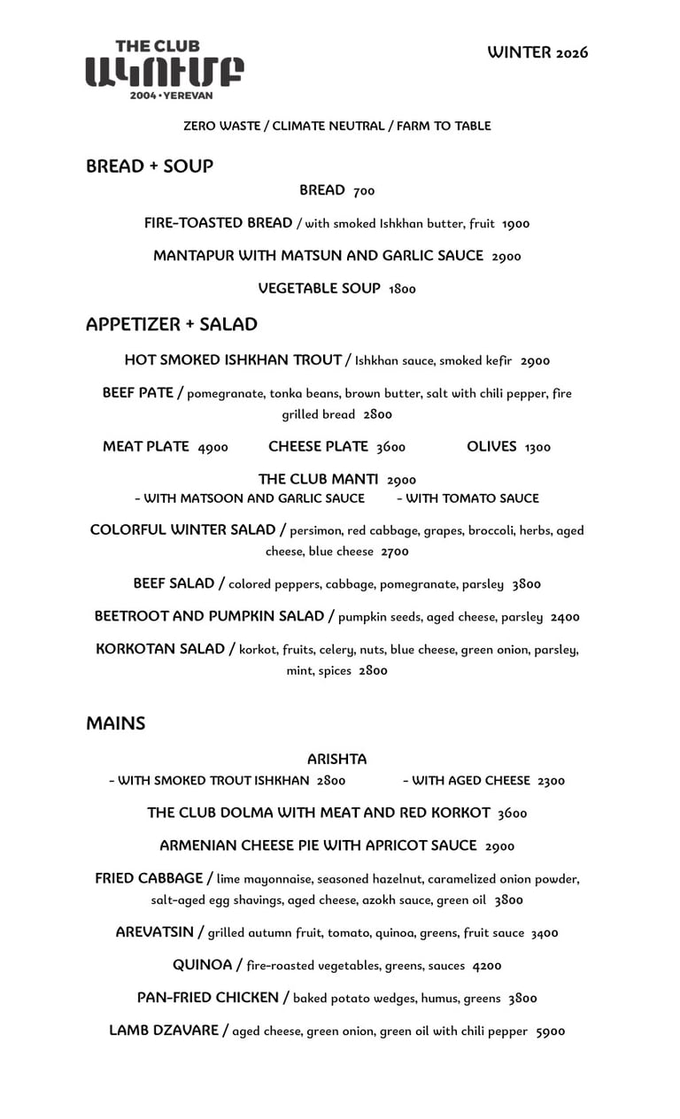 At The Club, we honor the rich bounty of Armenia’s land, using its finest, locally grown ingredients to craft dishes that surprise and delight. As a zero-waste restaurant, we are passionate about sustainability – working with ethical suppliers and supporting local farmers to ensure that every meal is both mindful and meaningful.