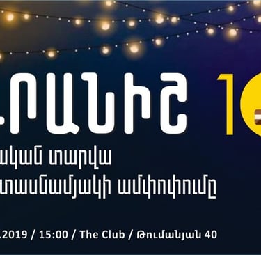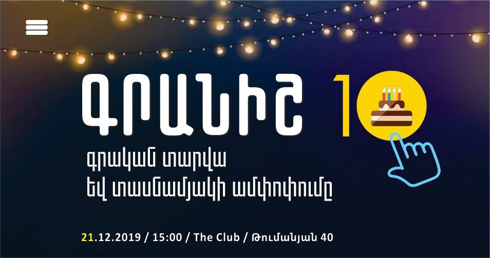 Սիրելի գրանիշցիներ՝ գրողներ, թարգմանիչներ, քննադատներ, լրագրողներ ու ընթերցողներ, մենք տաս տարեկան ենք և որոշել ենք մեր ծննդյան օրը նշել ամենամտերմիկ միջավայրում՝ ձեզ հետ: Ուստի, դեկտեմբերի 21-ին՝ ժամը 15. 00-ին, բոլորիդ հրավիրում ենք մեր ու ձեր կողմից շատ սիրելի The Club ակումբ (Թումանյան 40)՝ նշելու մեր գործունեության տասնամյակը՝ զուգահեռաբար ամփոփելով գրական տարի 2019-ը: Գինի, գրքեր, երաժշտություն ու հաճելի մթնոլորտը: